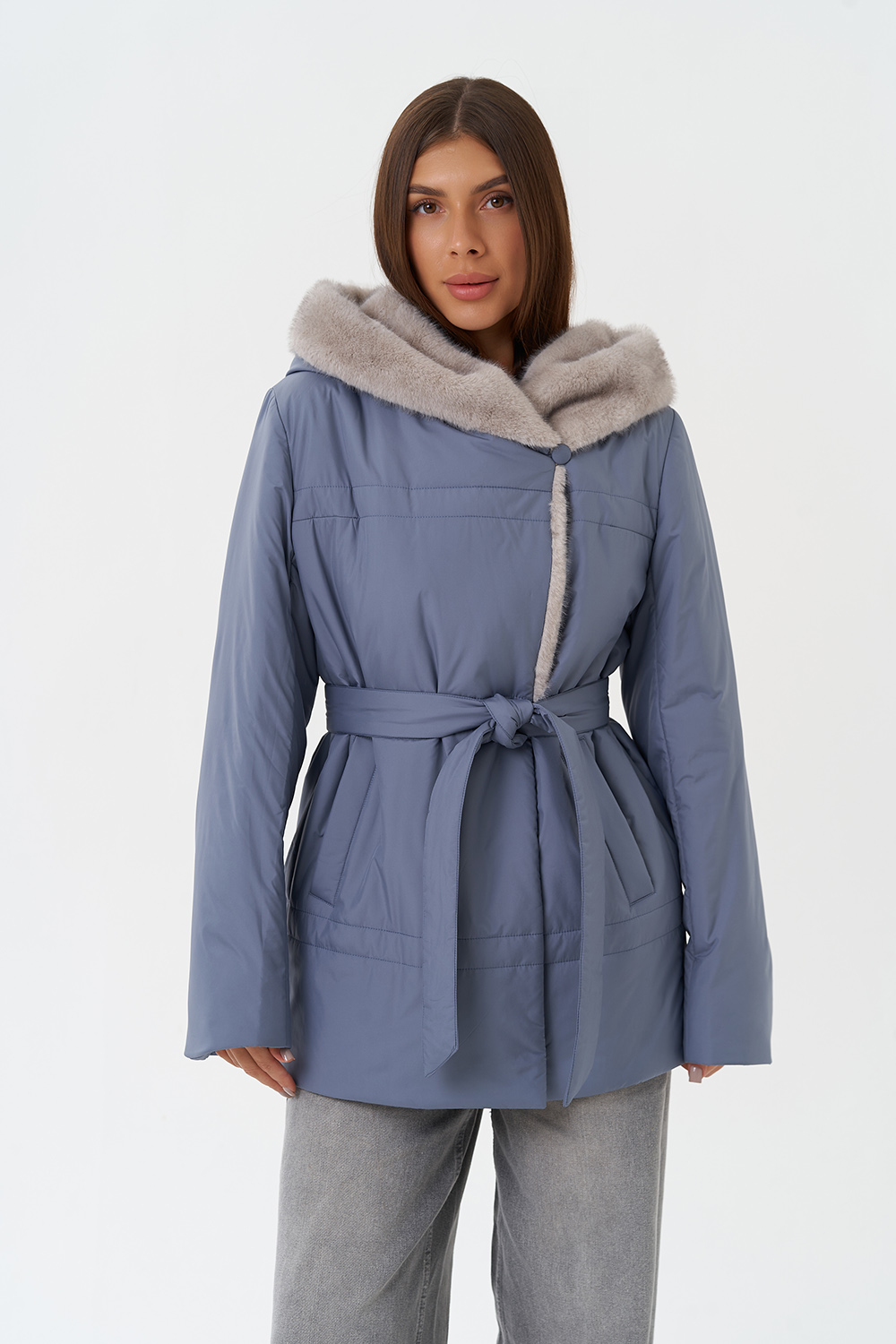 Крой воротника - капюшон, отделка эко мех под норку